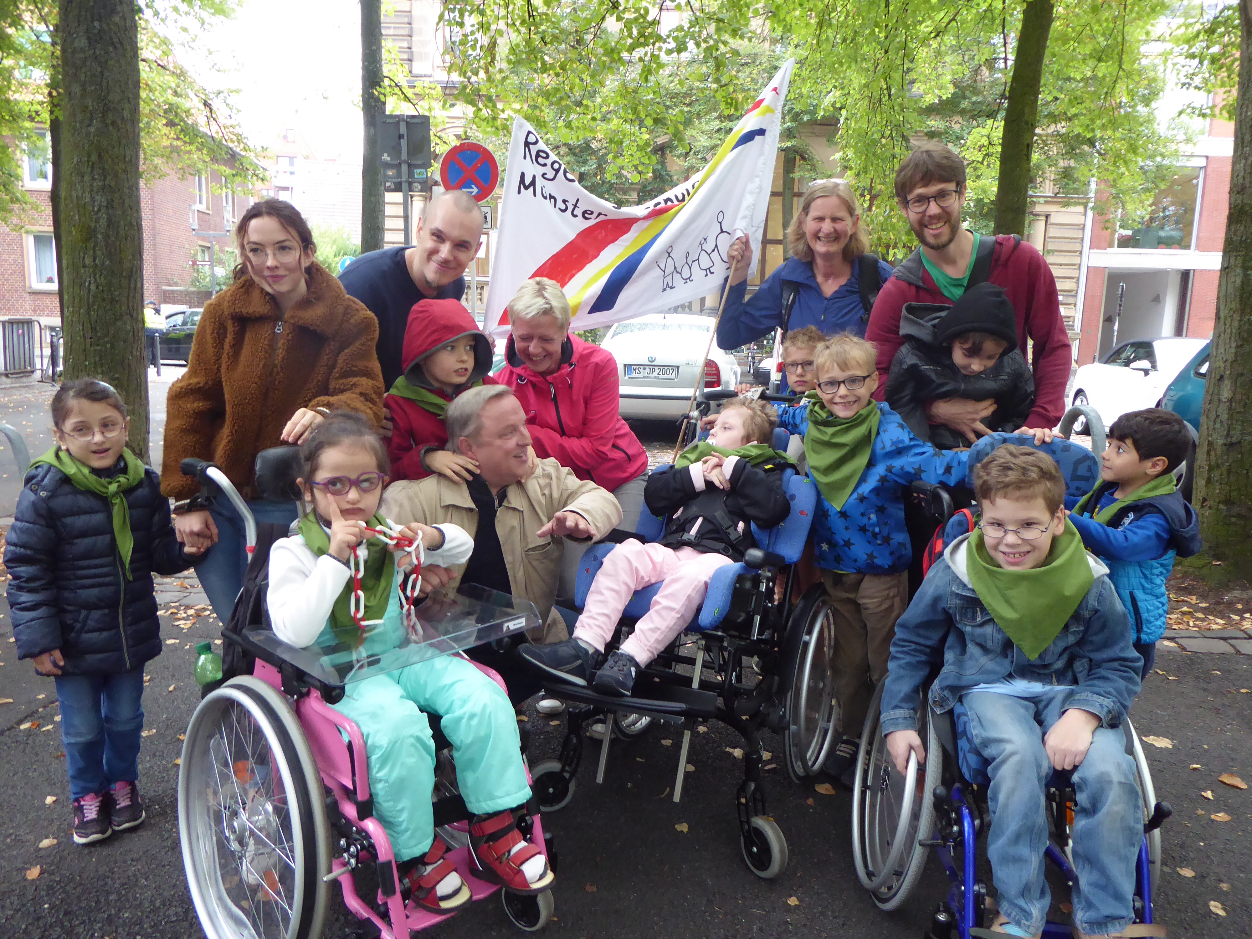 Aber nun kennen einige Schülerinnen und Schüler der Regenbogenschule den Schauspieler Axel Prahl ganz persönlich: Anlässlich des Friedensfestes auf dem Münsterschen Domplatz, wo sich traditionell einmal im Jahr viele Grund- und Förderschulen treffen und die Regenbogenschule mit einer Schülerdelegation seit Jahren dabei ist, gab es ein plötzliches Zusammentreffen mit Axel Prahl.
